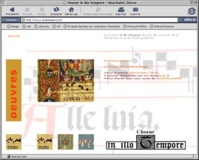 questioncomment présenter notre choeur sur internet solutions mibcréation d'une charte graphique et d'un site incluant le programme des activités du choeur, les compositeurs, les membres du choeur et un extrait musical avec une animation. dates du projet2001 - | ![]() |