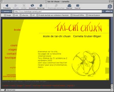 questioncomment améliorer la présentation de notre école, comment informer sur les cours et stages de tai chi de notre école et comment vendre nos produits ? solutions mibavec un développement de l'identité visuelle et avec un site internet comprenant la description de l'école et de ses professeurs, les horaires des cours dans les deux salles, le calendrier des stages et la boutique des livres et objets concernant le Tai Chi. Site en français et anglais. dates du projet2001 | ![]() |